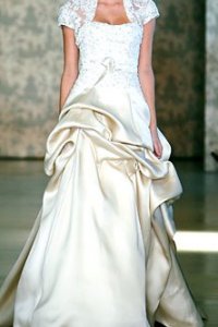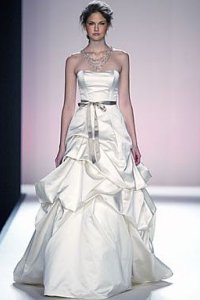 Monique Lhuillier. “Clementine.” HERE IT IS. THE ONE. (Well, please ignore the bolero/shrug the model is wearing — I ordered the strapless dress alone). From the embroidery and sparkle on the bodice, to the slight sweetheart neckline, to the pick-ups, to the bows and buttons on the train… I just LOVE it. SQUEE!!! I originally counted it out because it was over my budget but just could NOT stop thinking about it. I have committed to some serious saving during the next few months. YAY.