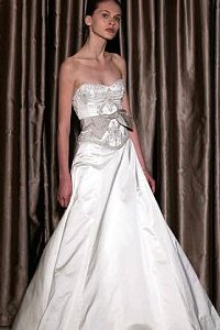 Monique Lhuillier. This is actually 2 pieces — a corset-type top with skirt. Beautiful material. Very light. This is part of ML’s platinum bridal collection, which means it is VERY expensive. Like celebrity expensive.