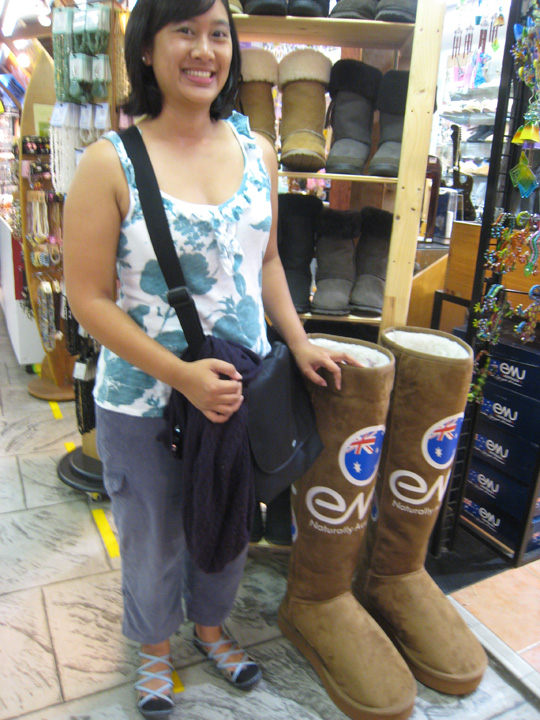 Later that day, we checked out the Night Markets, which was a lot smaller than I thought it would be. It’s basically a swap meet filled with cheesy Aussie souvenirs and one random aisle devoted to Chinese massages (???). I got a kick out of these sheepskin boots. They’re half as tall as I am!