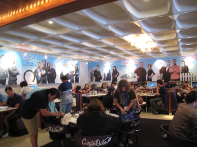 We decided to venture outside around noon for lunch (food options in the convention center are virtually nonexistent). SyFy took over one of the restaurants in the Hard Rock Hotel and converted it to Cafe Diem, which is a cafe in their show Eureka. We decided to try it and while the food was your average diner food, the branding was awesome.